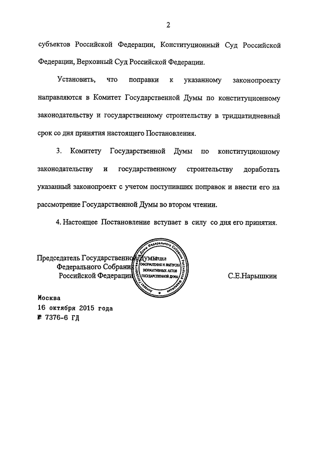 ПОСТАНОВЛЕНИЕ ГД ФС РФ от 16.10.2015 N 7376-6 ГД