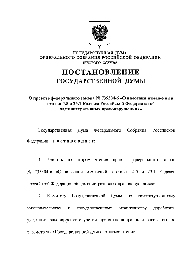 "О ПРОЕКТЕ ФЕДЕРАЛЬНОГО ЗАКОНА N 735304-6 "О ВНЕСЕНИИ ИЗМЕНЕНИЙ В СТАТЬИ 4.5 И 23.1 КОДЕКСА РОССИЙСКОЙ ФЕДЕРАЦИИ ОБ АДМИНИСТРАТИВНЫХ ПРАВОНАРУШЕНИЯХ"