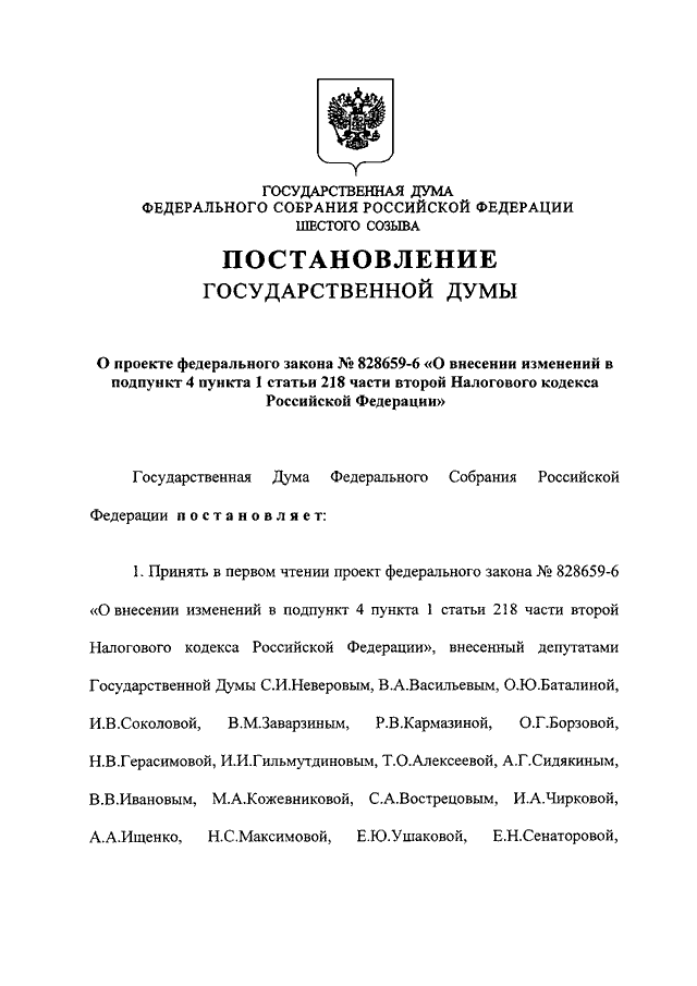 "О ПРОЕКТЕ ФЕДЕРАЛЬНОГО ЗАКОНА N 828659-6 "О ВНЕСЕНИИ ИЗМЕНЕНИЙ В ПОДПУНКТ 4 ПУНКТА 1 СТАТЬИ 218 ЧАСТИ ВТОРОЙ НАЛОГОВОГО КОДЕКСА РОССИЙСКОЙ ФЕДЕРАЦИИ"