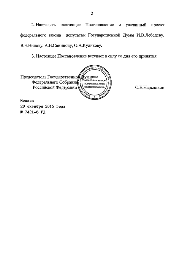 ПОСТАНОВЛЕНИЕ ГД ФС РФ от 20.10.2015 N 7421-6 ГД