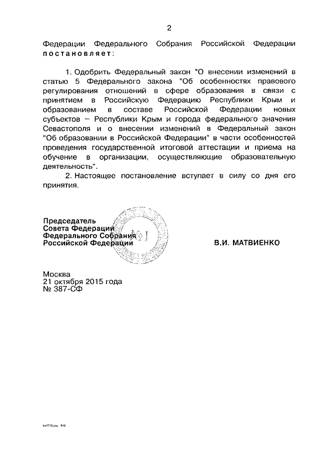 ПОСТАНОВЛЕНИЕ СФ ФС РФ от 21.10.2015 N 387-СФ