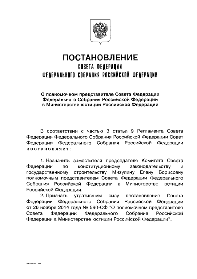 "О ПОЛНОМОЧНОМ ПРЕДСТАВИТЕЛЕ СОВЕТА ФЕДЕРАЦИИ ФЕДЕРАЛЬНОГО СОБРАНИЯ РОССИЙСКОЙ ФЕДЕРАЦИИ В МИНИСТЕРСТВЕ ЮСТИЦИИ РОССИЙСКОЙ ФЕДЕРАЦИИ"