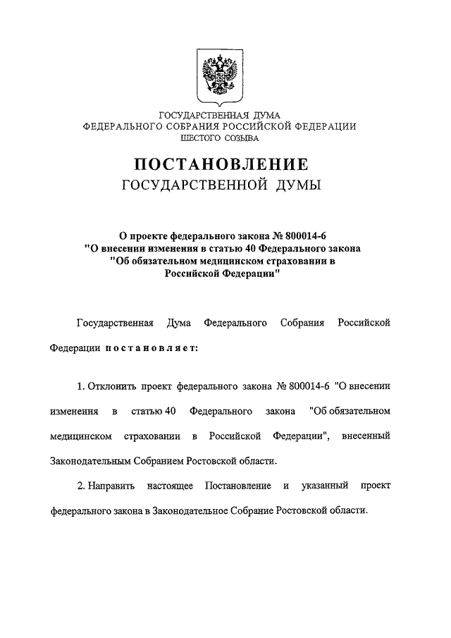 "О ПРОЕКТЕ ФЕДЕРАЛЬНОГО ЗАКОНА N 800014-6 "О ВНЕСЕНИИ ИЗМЕНЕНИЯ В СТАТЬЮ 40 ФЕДЕРАЛЬНОГО ЗАКОНА "ОБ ОБЯЗАТЕЛЬНОМ МЕДИЦИНСКОМ СТРАХОВАНИИ В РОССИЙСКОЙ ФЕДЕРАЦИИ"