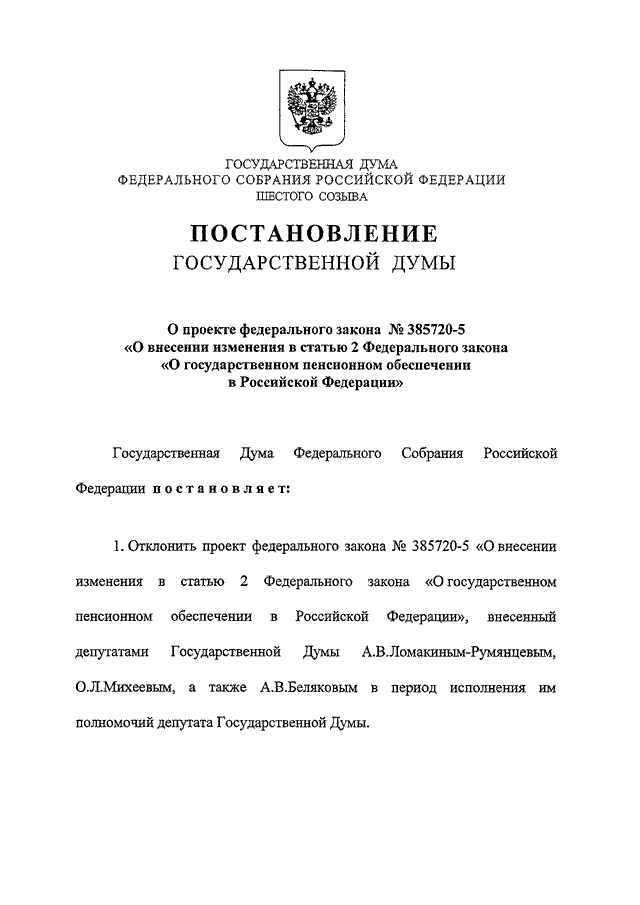 "О ПРОЕКТЕ ФЕДЕРАЛЬНОГО ЗАКОНА N 385720-5 "О ВНЕСЕНИИ ИЗМЕНЕНИЯ В СТАТЬЮ 2 ФЕДЕРАЛЬНОГО ЗАКОНА "О ГОСУДАРСТВЕННОМ ПЕНСИОННОМ ОБЕСПЕЧЕНИИ В РОССИЙСКОЙ ФЕДЕРАЦИИ"