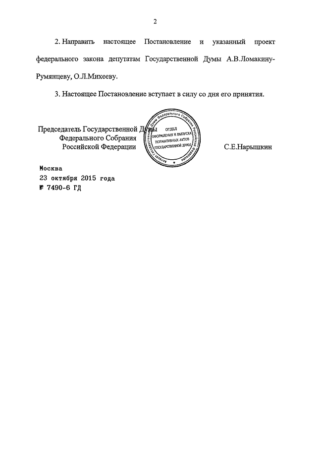 ПОСТАНОВЛЕНИЕ ГД ФС РФ от 23.10.2015 N 7490-6 ГД