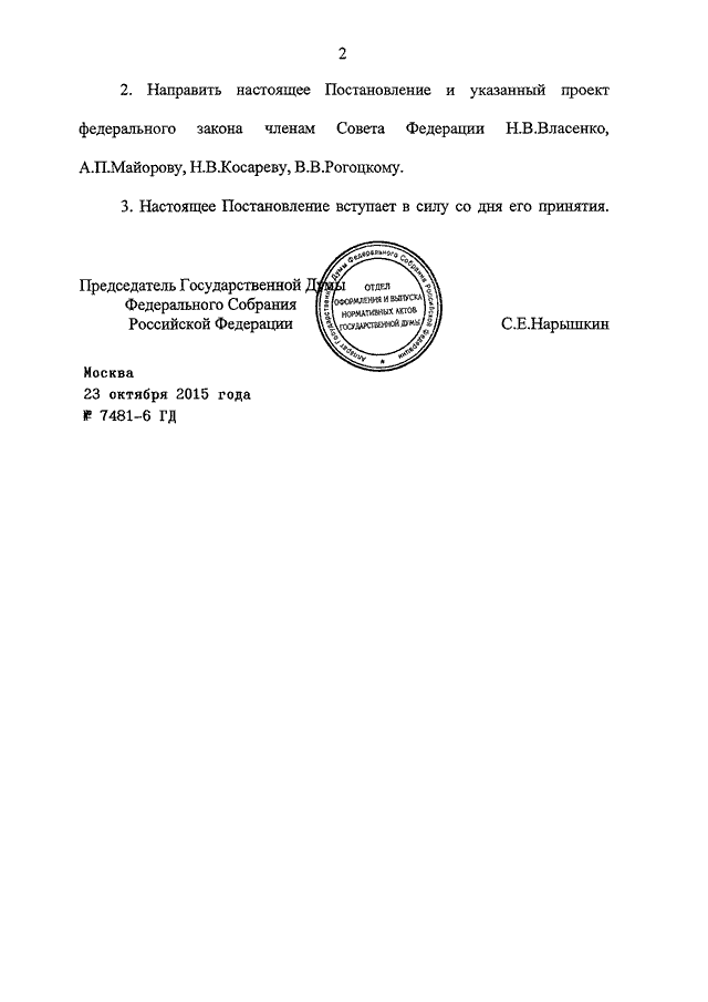 ПОСТАНОВЛЕНИЕ ГД ФС РФ от 23.10.2015 N 7481-6 ГД