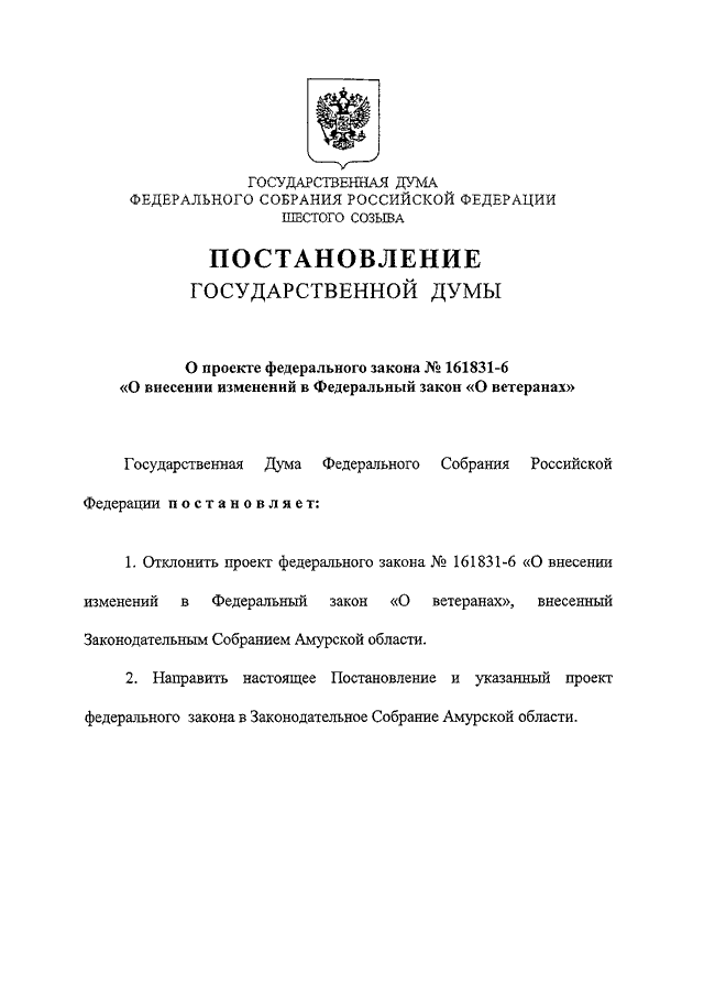 "О ПРОЕКТЕ ФЕДЕРАЛЬНОГО ЗАКОНА N 161831-6 "О ВНЕСЕНИИ ИЗМЕНЕНИЙ В ФЕДЕРАЛЬНЫЙ ЗАКОН "О ВЕТЕРАНАХ"