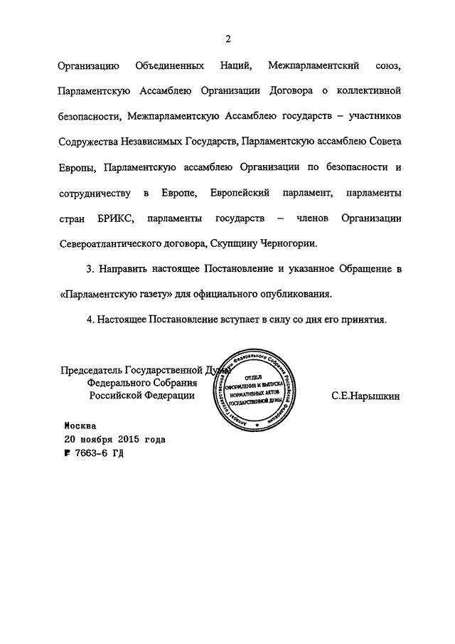 ПОСТАНОВЛЕНИЕ ГД ФС РФ от 20.11.2015 N 7663-6 ГД