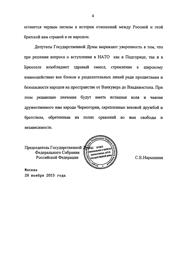 "ОБ ОБРАЩЕНИИ ГОСУДАРСТВЕННОЙ ДУМЫ ФЕДЕРАЛЬНОГО СОБРАНИЯ РОССИЙСКОЙ ФЕДЕРАЦИИ "К СКУПЩИНЕ ЧЕРНОГОРИИ, ПАРЛАМЕНТАРИЯМ ГОСУДАРСТВ - ЧЛЕНОВ ОРГАНИЗАЦИИ СЕВЕРОАТЛАНТИЧЕСКОГО ДОГОВОРА И ПАРЛАМЕНТСКОЙ АССАМБЛЕЕ ОРГАНИЗАЦИИ ПО БЕЗОПАСНОСТИ И СОТРУДНИЧЕСТВУ В ЕВРОПЕ"