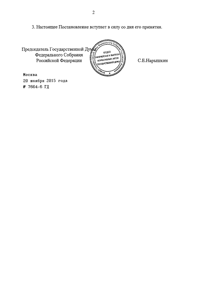 ПОСТАНОВЛЕНИЕ ГД ФС РФ от 20.11.2015 N 7664-6 ГД
