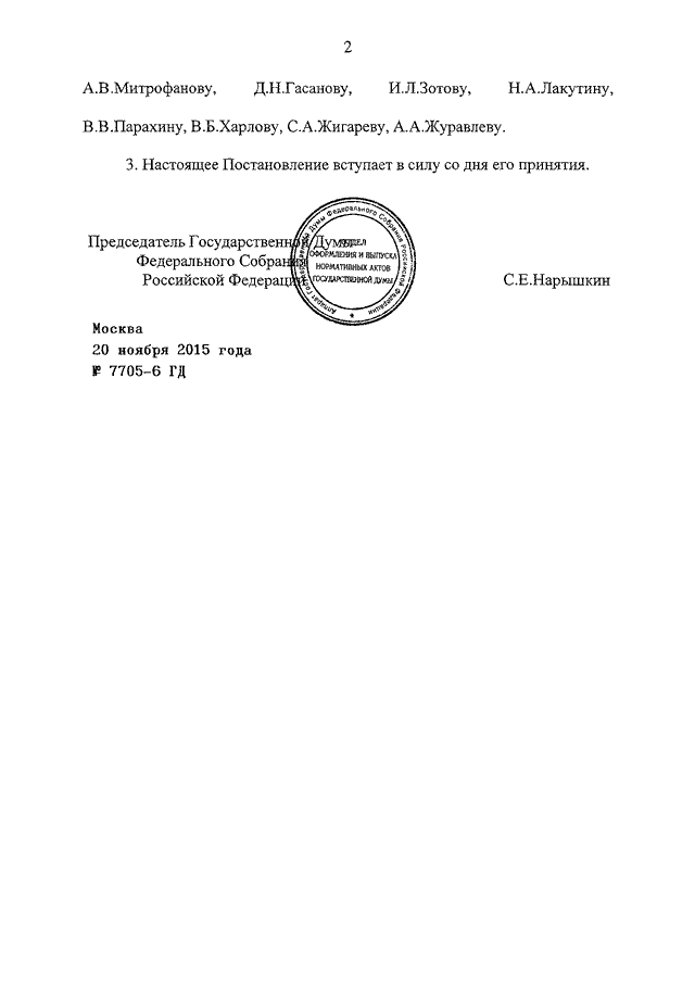 ПОСТАНОВЛЕНИЕ ГД ФС РФ от 20.11.2015 N 7705-6 ГД