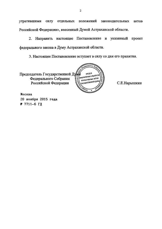 ПОСТАНОВЛЕНИЕ ГД ФС РФ от 20.11.2015 N 7711-6 ГД