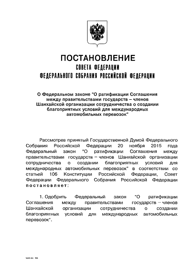 "О ФЕДЕРАЛЬНОМ ЗАКОНЕ "О РАТИФИКАЦИИ СОГЛАШЕНИЯ МЕЖДУ ПРАВИТЕЛЬСТВАМИ ГОСУДАРСТВ - ЧЛЕНОВ ШАНХАЙСКОЙ ОРГАНИЗАЦИИ СОТРУДНИЧЕСТВА О СОЗДАНИИ БЛАГОПРИЯТНЫХ УСЛОВИЙ ДЛЯ МЕЖДУНАРОДНЫХ АВТОМОБИЛЬНЫХ ПЕРЕВОЗОК"