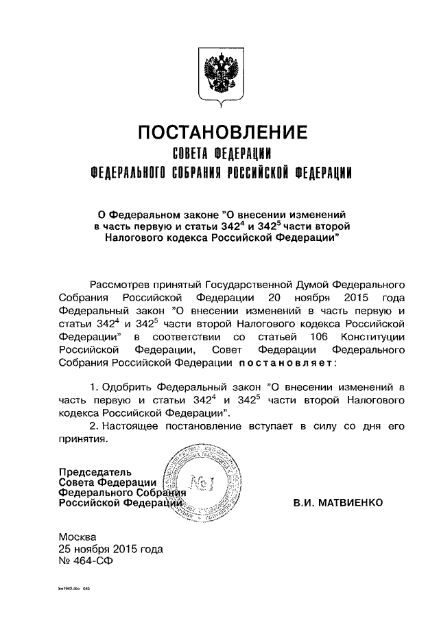 ПОСТАНОВЛЕНИЕ СФ ФС РФ от 25.11.2015 N 464-СФ