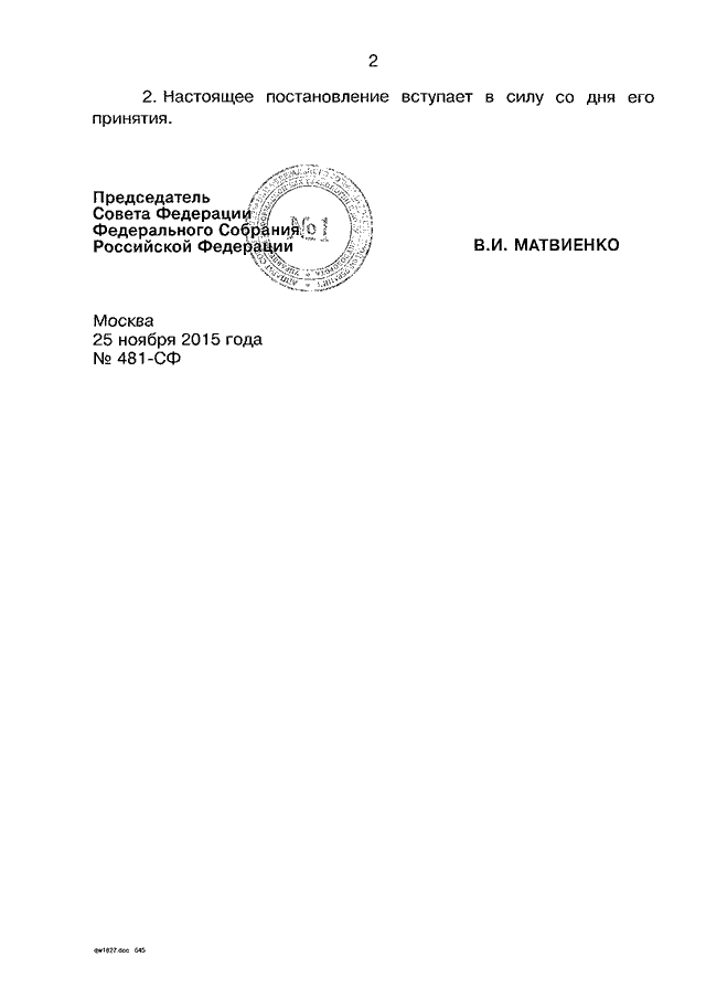 ПОСТАНОВЛЕНИЕ СФ ФС РФ от 25.11.2015 N 481-СФ
