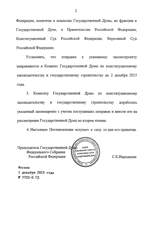 ПОСТАНОВЛЕНИЕ ГД ФС РФ от 01.12.2015 N 7722-6 ГД