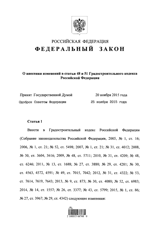 "О ВНЕСЕНИИ ИЗМЕНЕНИЙ В СТАТЬИ 48 И 51 ГРАДОСТРОИТЕЛЬНОГО КОДЕКСА РОССИЙСКОЙ ФЕДЕРАЦИИ"