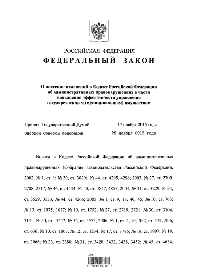 "О ВНЕСЕНИИ ИЗМЕНЕНИЙ В КОДЕКС РОССИЙСКОЙ ФЕДЕРАЦИИ ОБ АДМИНИСТРАТИВНЫХ ПРАВОНАРУШЕНИЯХ В ЧАСТИ ПОВЫШЕНИЯ ЭФФЕКТИВНОСТИ УПРАВЛЕНИЯ ГОСУДАРСТВЕННЫМ (МУНИЦИПАЛЬНЫМ) ИМУЩЕСТВОМ"