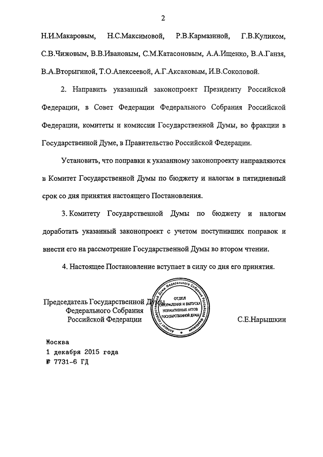 ПОСТАНОВЛЕНИЕ ГД ФС РФ от 01.12.2015 N 7731-6 ГД