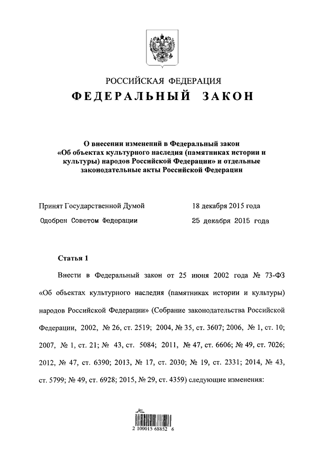"О ВНЕСЕНИИ ИЗМЕНЕНИЙ В ФЕДЕРАЛЬНЫЙ ЗАКОН "ОБ ОБЪЕКТАХ КУЛЬТУРНОГО НАСЛЕДИЯ (ПАМЯТНИКАХ ИСТОРИИ И КУЛЬТУРЫ) НАРОДОВ РОССИЙСКОЙ ФЕДЕРАЦИИ" И ОТДЕЛЬНЫЕ ЗАКОНОДАТЕЛЬНЫЕ АКТЫ РОССИЙСКОЙ ФЕДЕРАЦИИ"