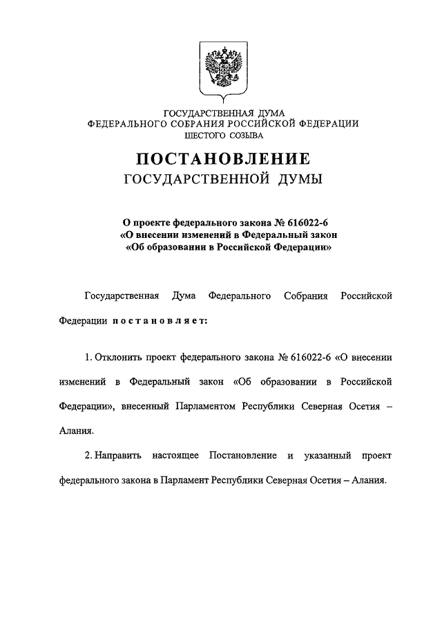 "О ПРОЕКТЕ ФЕДЕРАЛЬНОГО ЗАКОНА N 616022-6 "О ВНЕСЕНИИ ИЗМЕНЕНИЙ В ФЕДЕРАЛЬНЫЙ ЗАКОН "ОБ ОБРАЗОВАНИИ В РОССИЙСКОЙ ФЕДЕРАЦИИ"