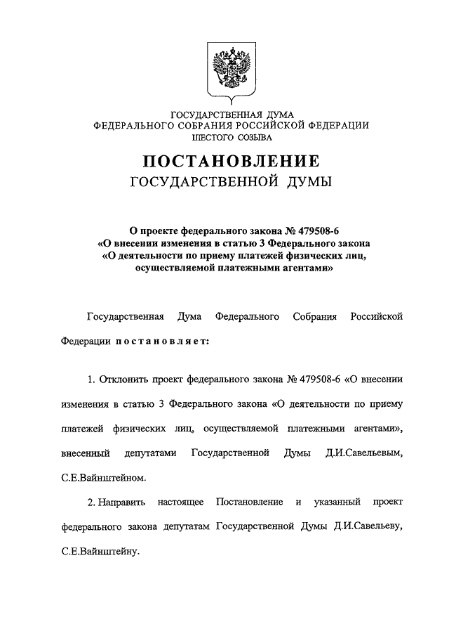 "О ПРОЕКТЕ ФЕДЕРАЛЬНОГО ЗАКОНА N 479508-6 "О ВНЕСЕНИИ ИЗМЕНЕНИЯ В СТАТЬЮ 3 ФЕДЕРАЛЬНОГО ЗАКОНА "О ДЕЯТЕЛЬНОСТИ ПО ПРИЕМУ ПЛАТЕЖЕЙ ФИЗИЧЕСКИХ ЛИЦ, ОСУЩЕСТВЛЯЕМОЙ ПЛАТЕЖНЫМИ АГЕНТАМИ"