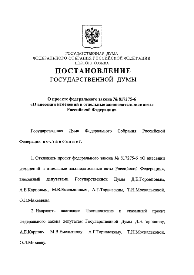 "О ПРОЕКТЕ ФЕДЕРАЛЬНОГО ЗАКОНА N 817275-6 "О ВНЕСЕНИИ ИЗМЕНЕНИЙ В ОТДЕЛЬНЫЕ ЗАКОНОДАТЕЛЬНЫЕ АКТЫ РОССИЙСКОЙ ФЕДЕРАЦИИ"