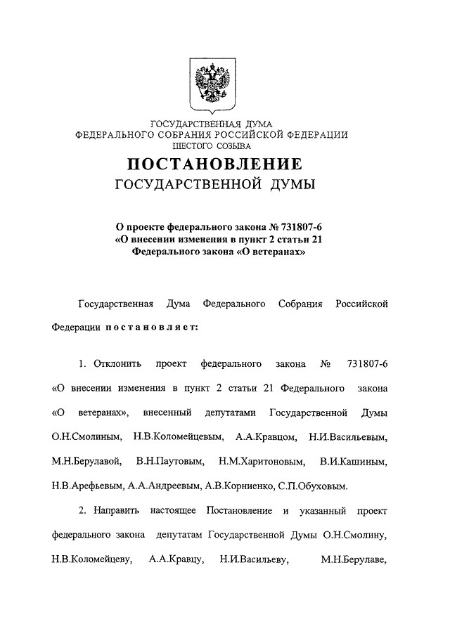 "О ПРОЕКТЕ ФЕДЕРАЛЬНОГО ЗАКОНА N 731807-6 "О ВНЕСЕНИИ ИЗМЕНЕНИЯ В ПУНКТ 2 СТАТЬИ 21 ФЕДЕРАЛЬНОГО ЗАКОНА "О ВЕТЕРАНАХ"