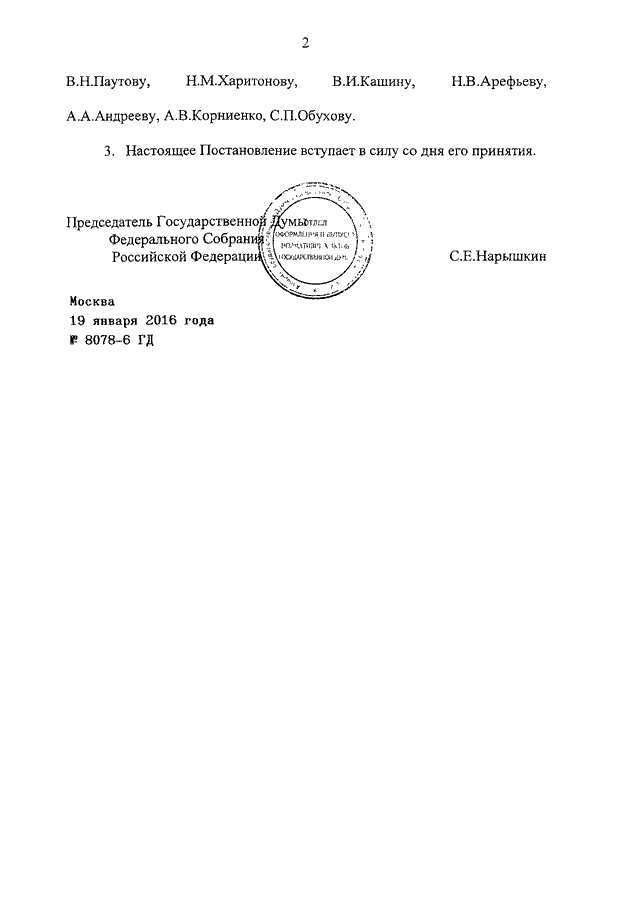 ПОСТАНОВЛЕНИЕ ГД ФС РФ от 19.01.2016 N 8078-6 ГД