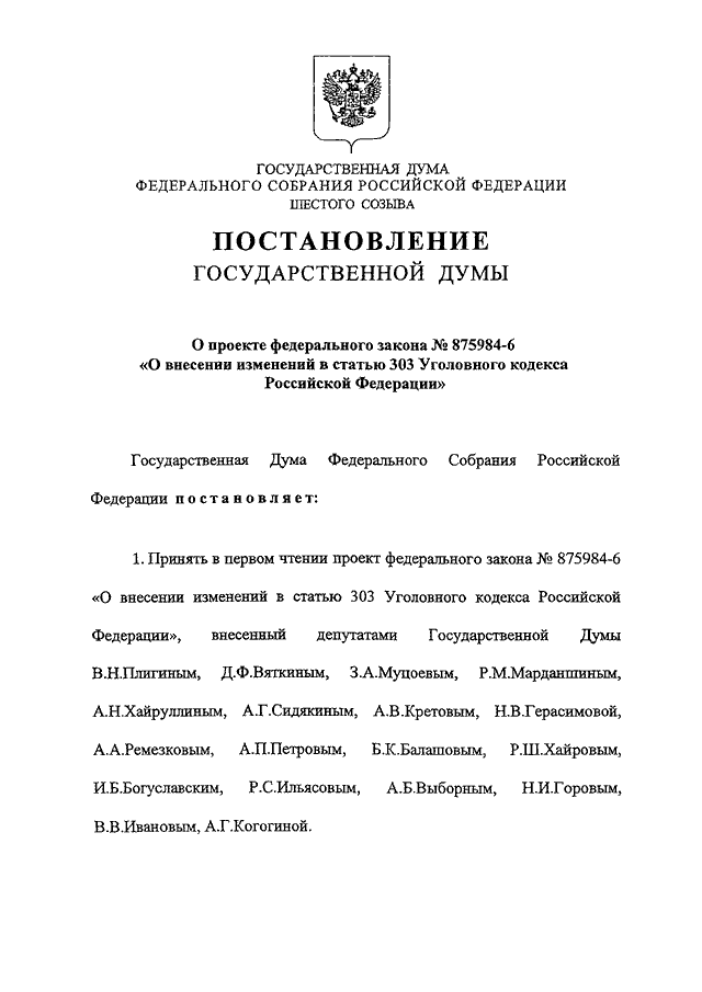 "О ПРОЕКТЕ ФЕДЕРАЛЬНОГО ЗАКОНА N 875984-6 "О ВНЕСЕНИИ ИЗМЕНЕНИЙ В СТАТЬЮ 303 УГОЛОВНОГО КОДЕКСА РОССИЙСКОЙ ФЕДЕРАЦИИ"
