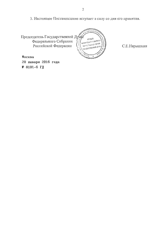 ПОСТАНОВЛЕНИЕ ГД ФС РФ от 20.01.2016 N 8101-6 ГД