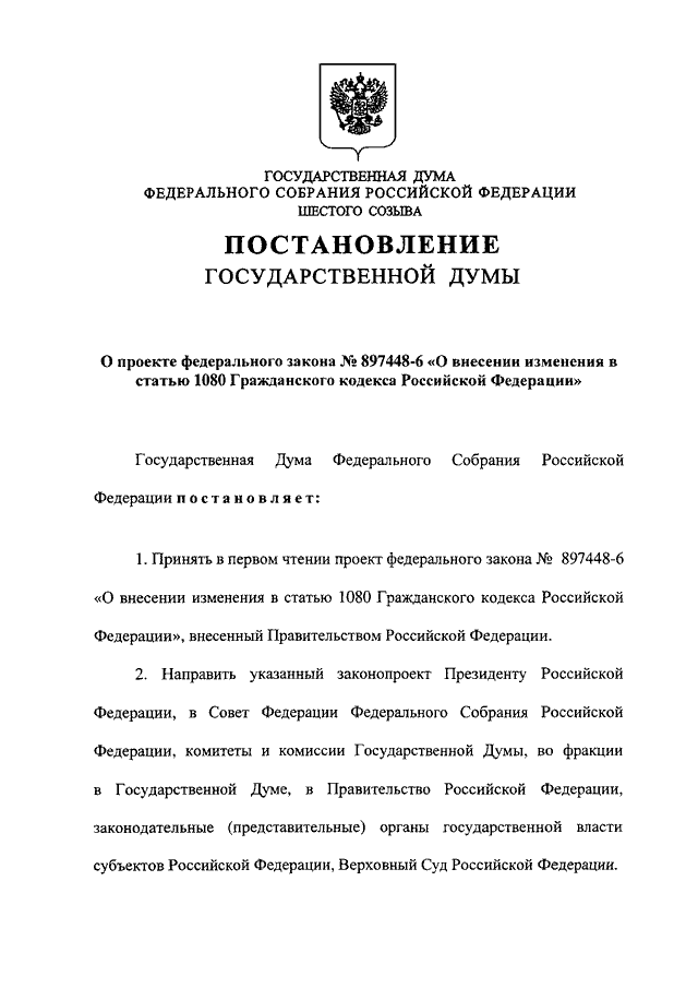 "О ПРОЕКТЕ ФЕДЕРАЛЬНОГО ЗАКОНА N 897448-6 "О ВНЕСЕНИИ ИЗМЕНЕНИЯ В СТАТЬЮ 1080 ГРАЖДАНСКОГО КОДЕКСА РОССИЙСКОЙ ФЕДЕРАЦИИ"
