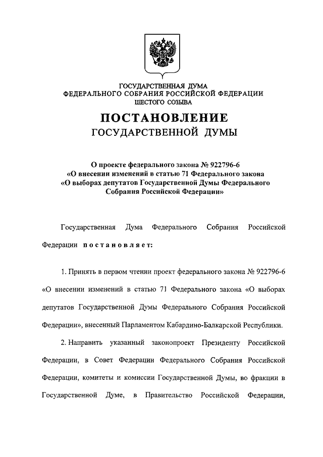 "О ПРОЕКТЕ ФЕДЕРАЛЬНОГО ЗАКОНА N 922796-6 "О ВНЕСЕНИИ ИЗМЕНЕНИЙ В СТАТЬЮ 71 ФЕДЕРАЛЬНОГО ЗАКОНА "О ВЫБОРАХ ДЕПУТАТОВ ГОСУДАРСТВЕННОЙ ДУМЫ ФЕДЕРАЛЬНОГО СОБРАНИЯ РОССИЙСКОЙ ФЕДЕРАЦИИ"