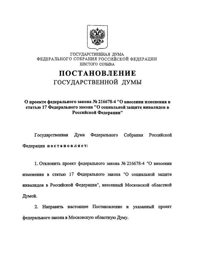 "О ПРОЕКТЕ ФЕДЕРАЛЬНОГО ЗАКОНА N 216678-4 "О ВНЕСЕНИИ ИЗМЕНЕНИЯ В СТАТЬЮ 17 ФЕДЕРАЛЬНОГО ЗАКОНА "О СОЦИАЛЬНОЙ ЗАЩИТЕ ИНВАЛИДОВ В РОССИЙСКОЙ ФЕДЕРАЦИИ"