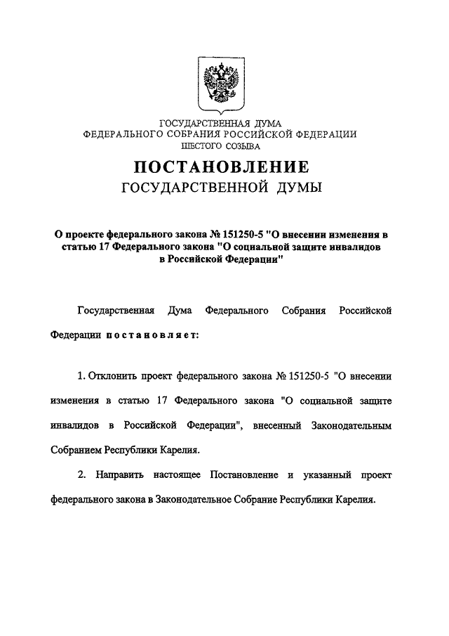 "О ПРОЕКТЕ ФЕДЕРАЛЬНОГО ЗАКОНА N 151250-5 "О ВНЕСЕНИИ ИЗМЕНЕНИЯ В СТАТЬЮ 17 ФЕДЕРАЛЬНОГО ЗАКОНА "О СОЦИАЛЬНОЙ ЗАЩИТЕ ИНВАЛИДОВ В РОССИЙСКОЙ ФЕДЕРАЦИИ"