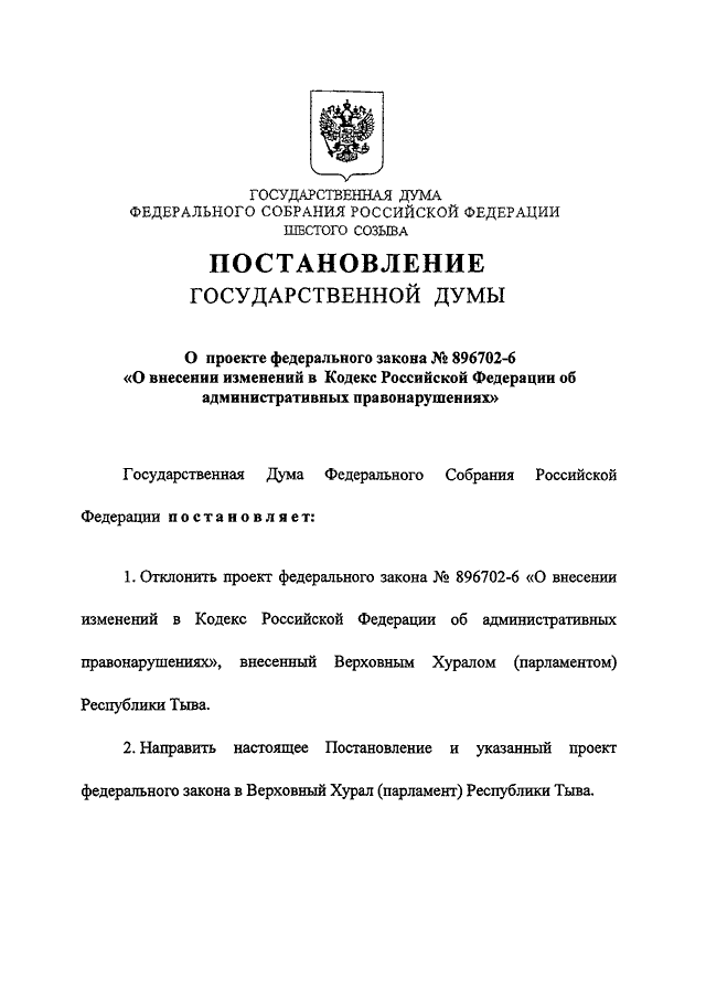 "О ПРОЕКТЕ ФЕДЕРАЛЬНОГО ЗАКОНА N 896702-6 "О ВНЕСЕНИИ ИЗМЕНЕНИЙ В КОДЕКС РОССИЙСКОЙ ФЕДЕРАЦИИ ОБ АДМИНИСТРАТИВНЫХ ПРАВОНАРУШЕНИЯХ"