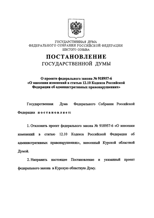 "О ПРОЕКТЕ ФЕДЕРАЛЬНОГО ЗАКОНА N 918957-6 "О ВНЕСЕНИИ ИЗМЕНЕНИЙ В СТАТЬЮ 12.10 КОДЕКСА РОССИЙСКОЙ ФЕДЕРАЦИИ ОБ АДМИНИСТРАТИВНЫХ ПРАВОНАРУШЕНИЯХ"