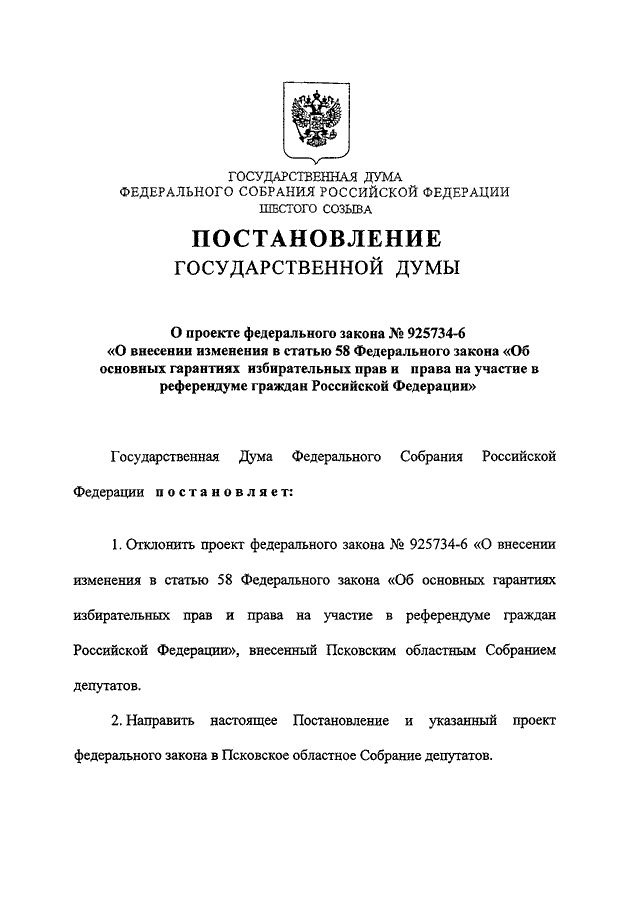 "О ПРОЕКТЕ ФЕДЕРАЛЬНОГО ЗАКОНА N 925734-6 "О ВНЕСЕНИИ ИЗМЕНЕНИЯ В СТАТЬЮ 58 ФЕДЕРАЛЬНОГО ЗАКОНА "ОБ ОСНОВНЫХ ГАРАНТИЯХ ИЗБИРАТЕЛЬНЫХ ПРАВ И ПРАВА НА УЧАСТИЕ В РЕФЕРЕНДУМЕ ГРАЖДАН РОССИЙСКОЙ ФЕДЕРАЦИИ"