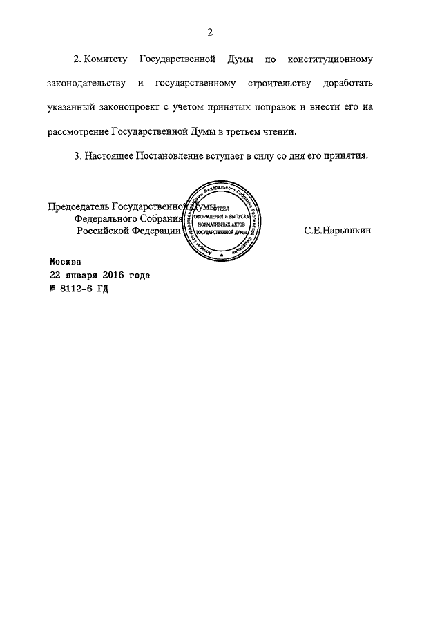 ПОСТАНОВЛЕНИЕ ГД ФС РФ от 22.01.2016 N 8112-6 ГД