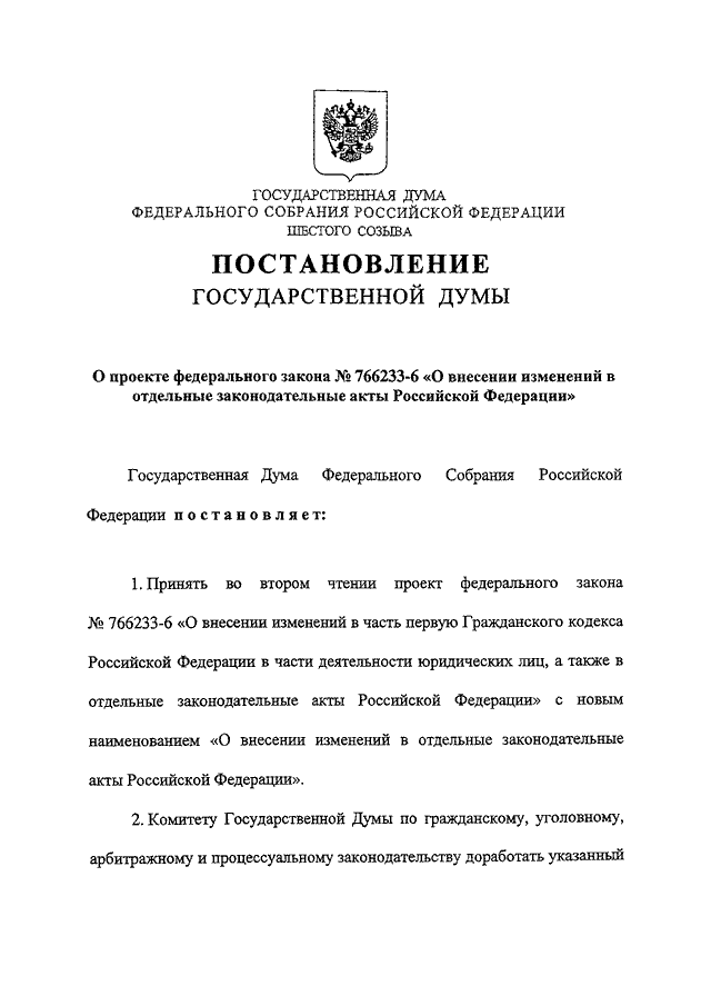 "О ПРОЕКТЕ ФЕДЕРАЛЬНОГО ЗАКОНА N 766233-6 "О ВНЕСЕНИИ ИЗМЕНЕНИЙ В ОТДЕЛЬНЫЕ ЗАКОНОДАТЕЛЬНЫЕ АКТЫ РОССИЙСКОЙ ФЕДЕРАЦИИ"