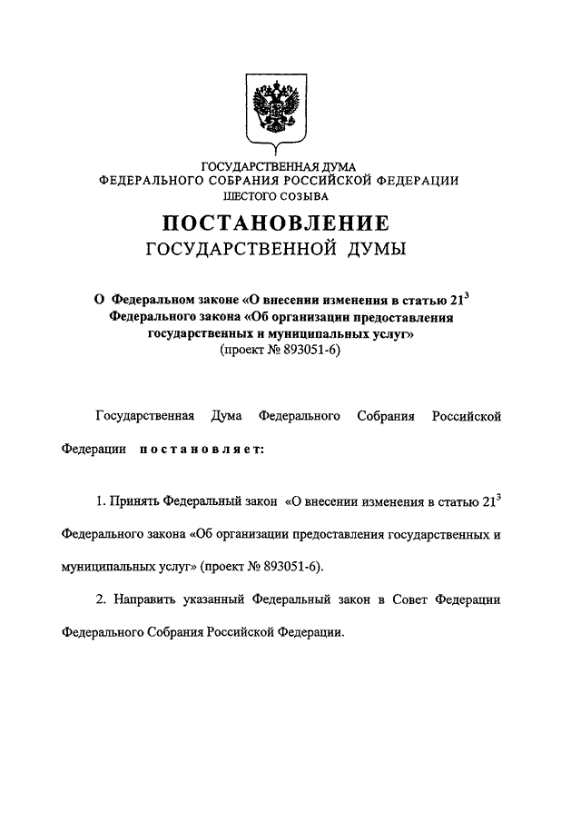 "О ФЕДЕРАЛЬНОМ ЗАКОНЕ "О ВНЕСЕНИИ ИЗМЕНЕНИЯ В СТАТЬЮ 21.3 ФЕДЕРАЛЬНОГО ЗАКОНА "ОБ ОРГАНИЗАЦИИ ПРЕДОСТАВЛЕНИЯ ГОСУДАРСТВЕННЫХ И МУНИЦИПАЛЬНЫХ УСЛУГ" (ПРОЕКТ N 893051-6)"