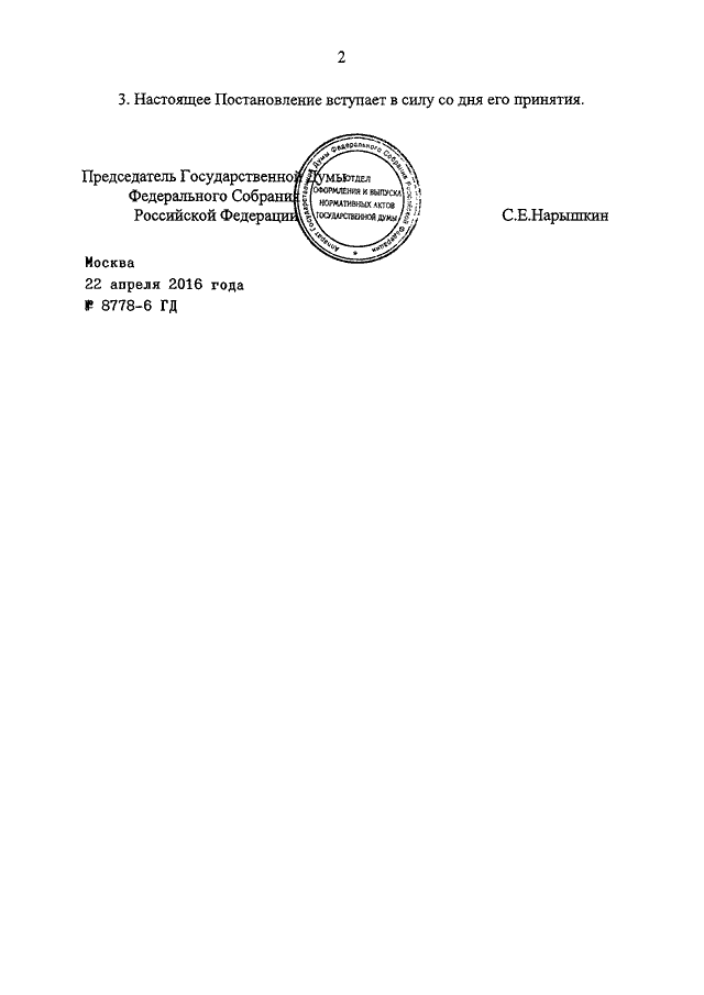 ПОСТАНОВЛЕНИЕ ГД ФС РФ от 22.04.2016 N 8778-6 ГД