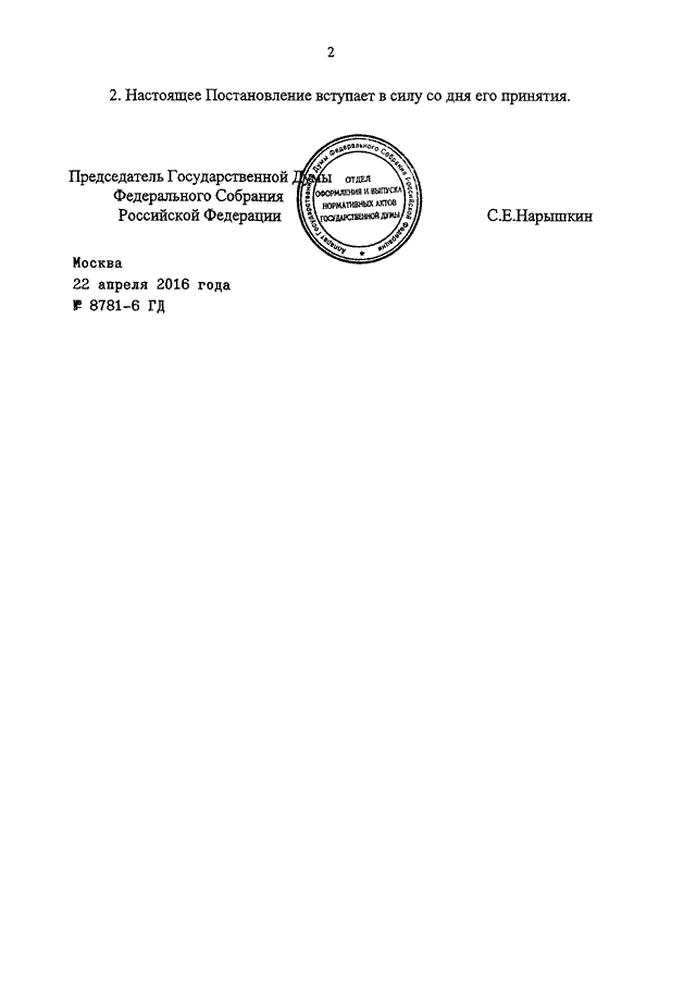 ПОСТАНОВЛЕНИЕ ГД ФС РФ от 22.04.2016 N 8781-6 ГД