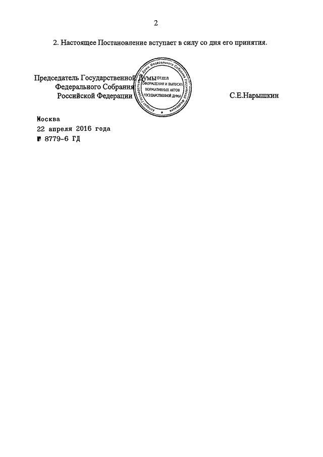 ПОСТАНОВЛЕНИЕ ГД ФС РФ от 22.04.2016 N 8779-6 ГД