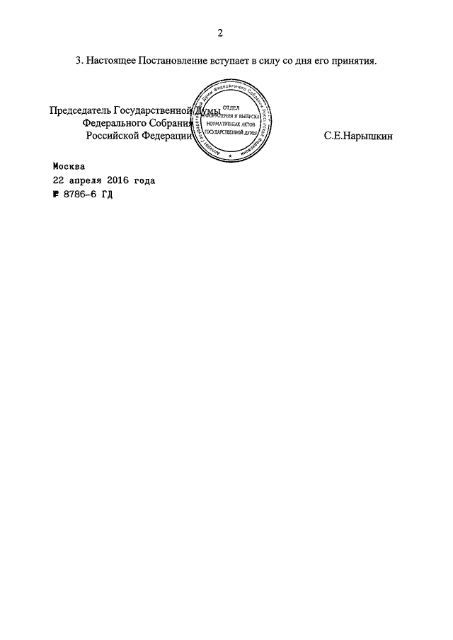 ПОСТАНОВЛЕНИЕ ГД ФС РФ от 22.04.2016 N 8786-6 ГД