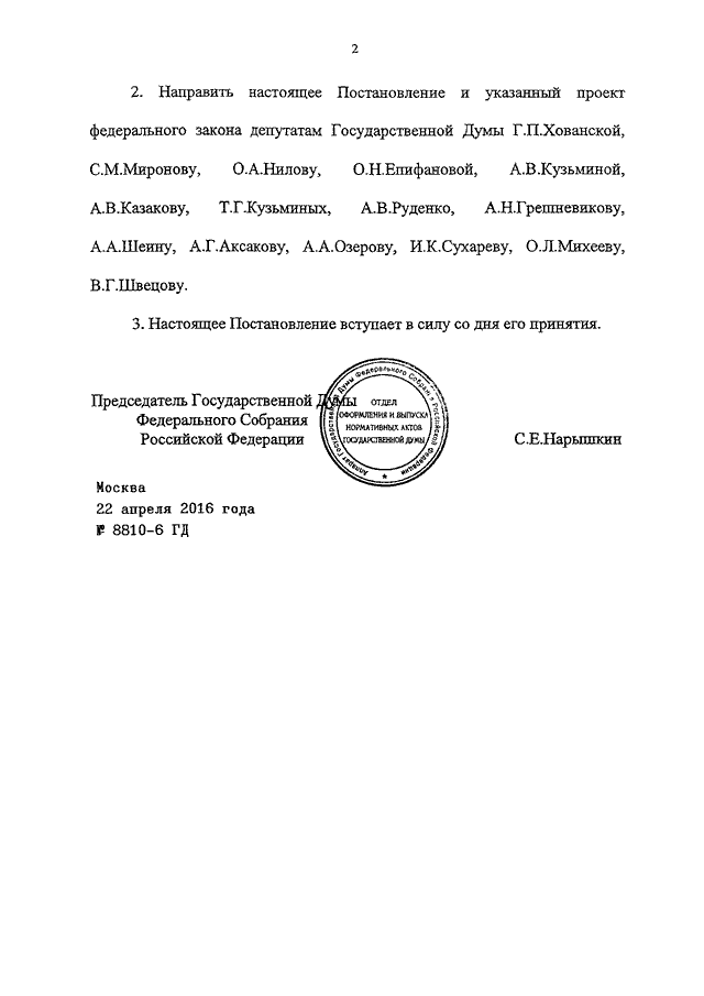 ПОСТАНОВЛЕНИЕ ГД ФС РФ от 22.04.2016 N 8810-6 ГД