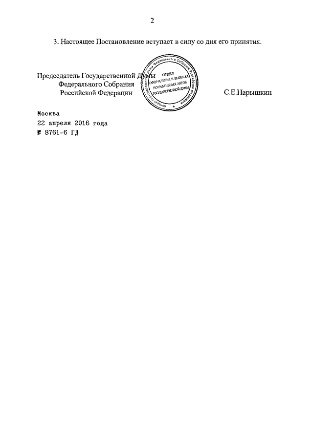 ПОСТАНОВЛЕНИЕ ГД ФС РФ от 22.04.2016 N 8761-6 ГД