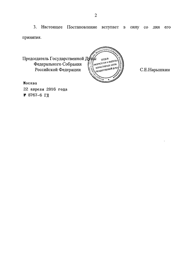 ПОСТАНОВЛЕНИЕ ГД ФС РФ от 22.04.2016 N 8767-6 ГД