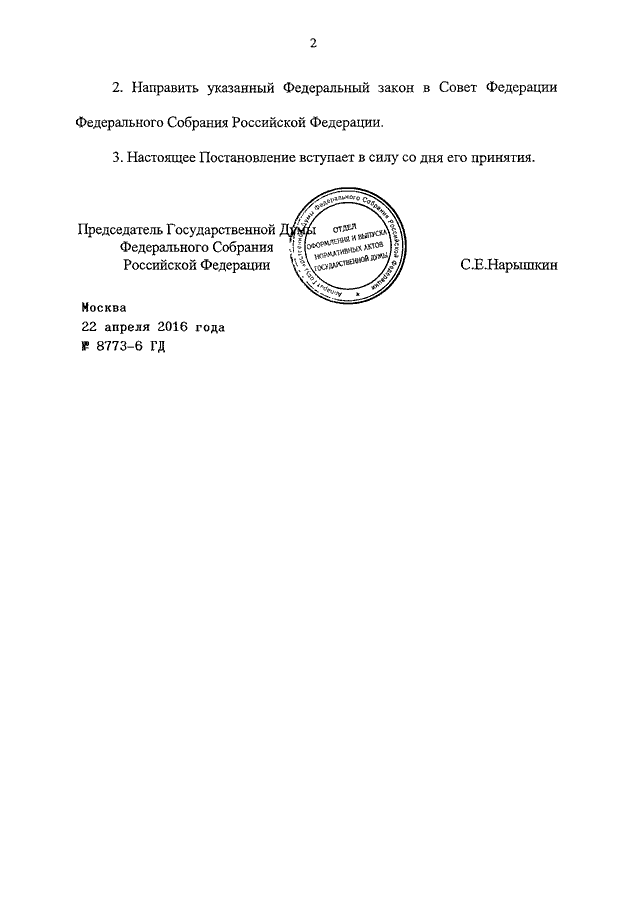 ПОСТАНОВЛЕНИЕ ГД ФС РФ от 22.04.2016 N 8773-6 ГД