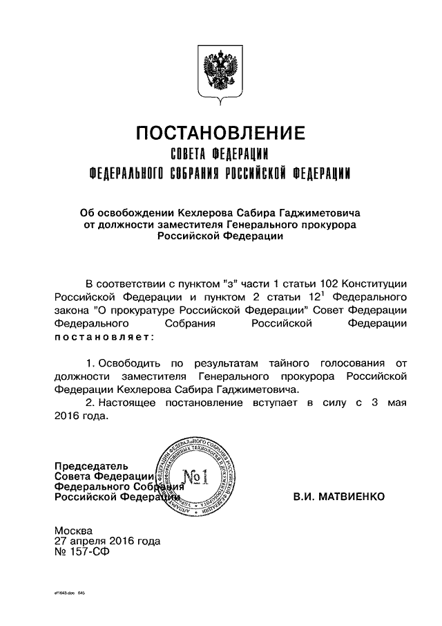 ПОСТАНОВЛЕНИЕ СФ ФС РФ от 27.04.2016 N 157-СФ